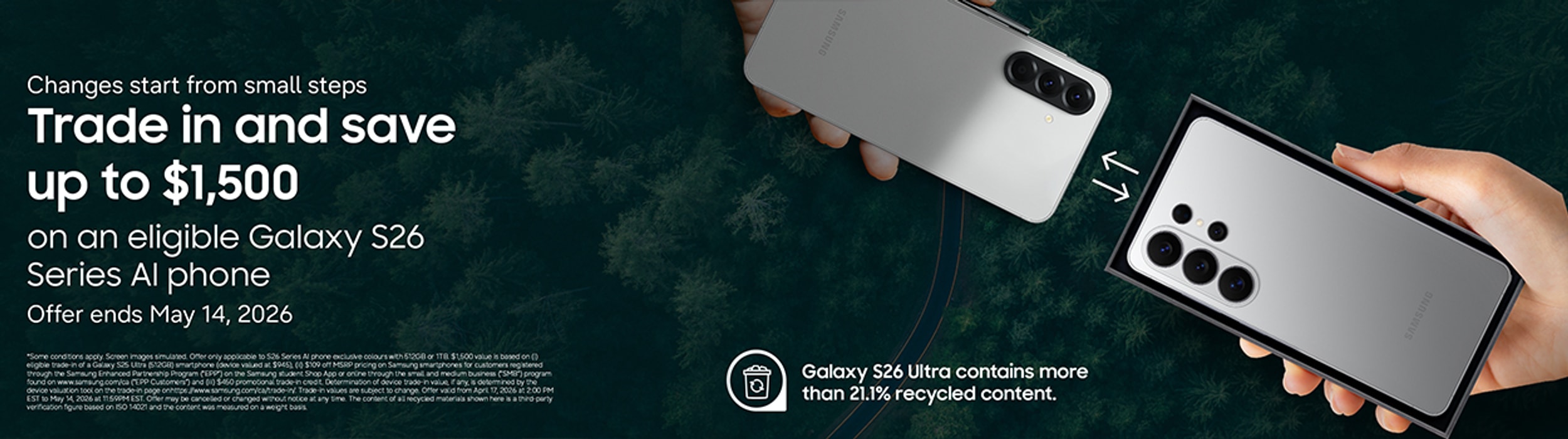 Trade in and save up to $1,500 on an eligible Galaxy S26 Series AI phone.